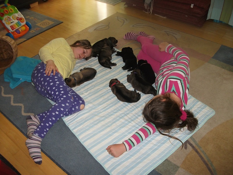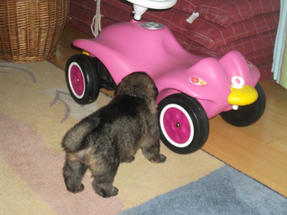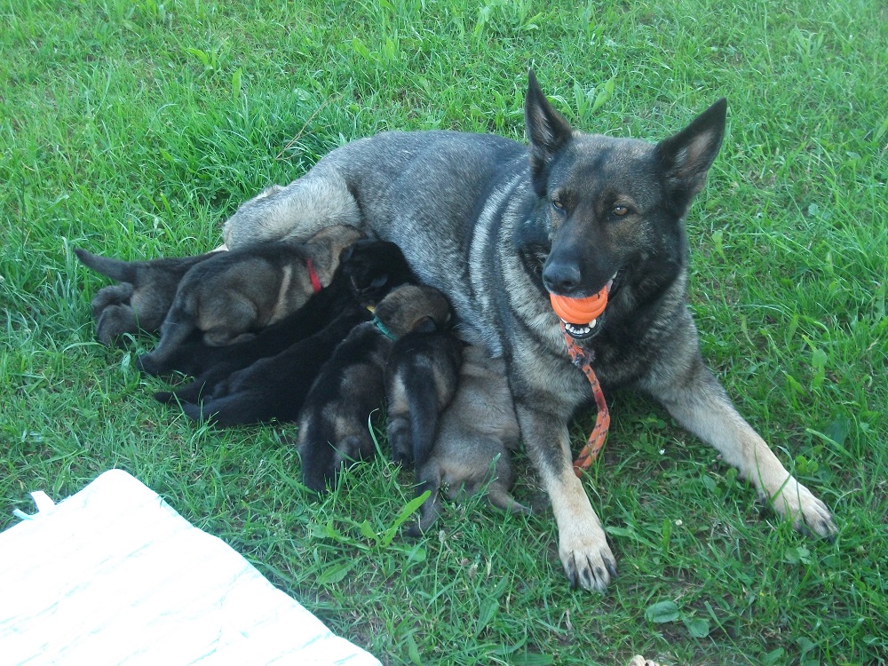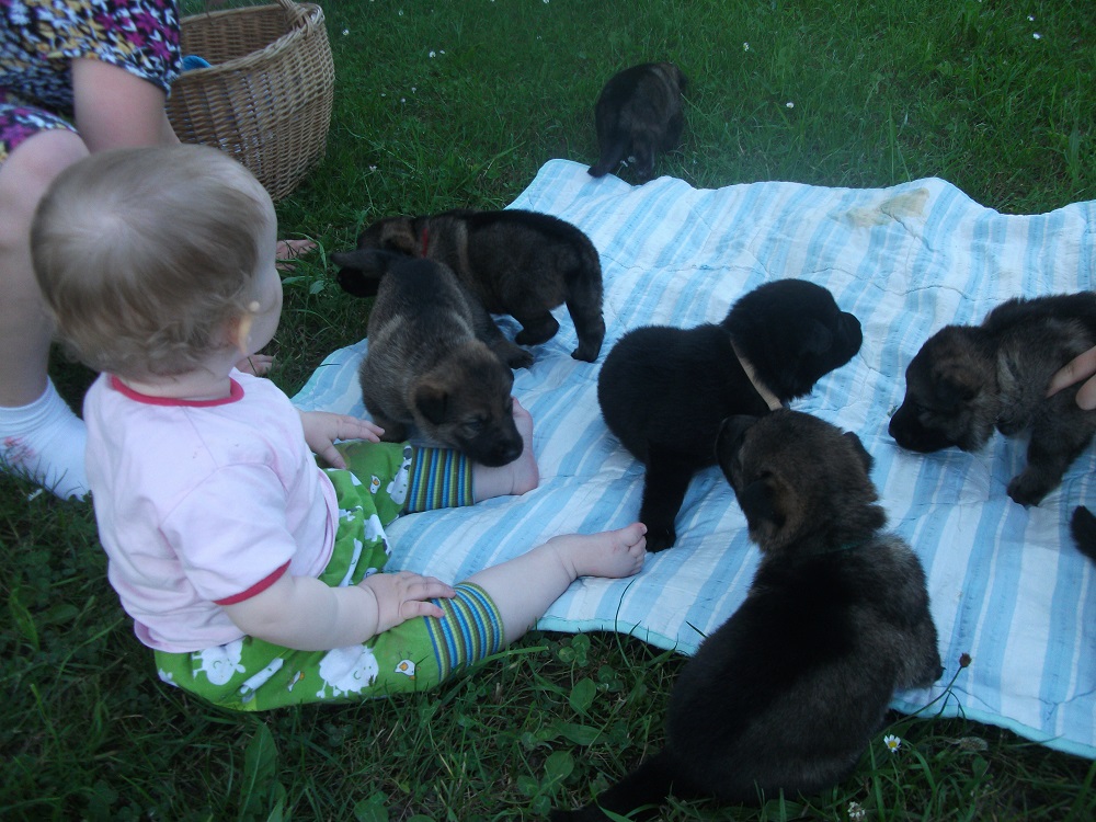 Die Welpen werden bei uns im Haus geboren und kommen dann nach der 3. Woche raus in den Zwinger mit Freilauf. Natürlich dürfen sie unter Aufsicht den ganzen Hof erkunden und lernen andere Tiere, Traktoren, laute Geräusche, verschiedene Böden usw. kennen.
